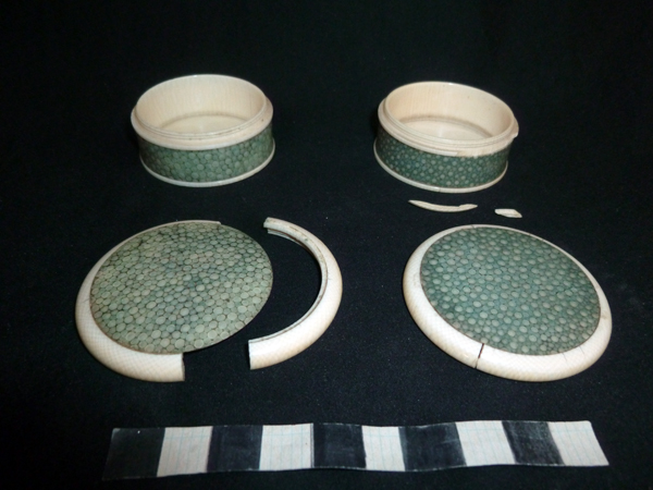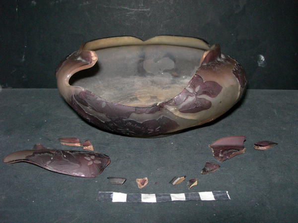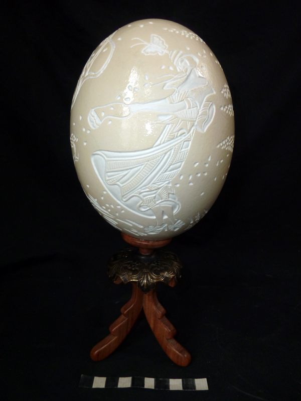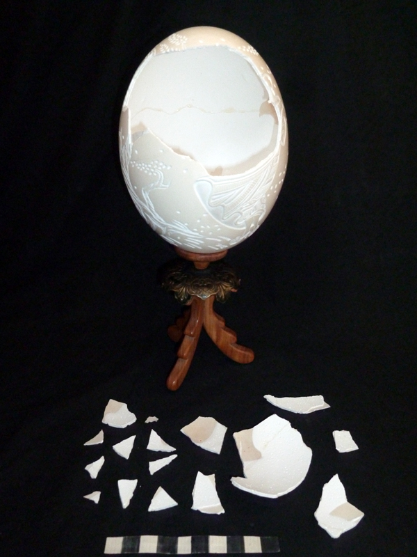 La restauration de cette pièce fut particulièrement délicate : les tranches très fines et la forme fermée de l’œuf exigeaient un collage méthodique et extrêmement précis pour garantir un ajustement parfait.