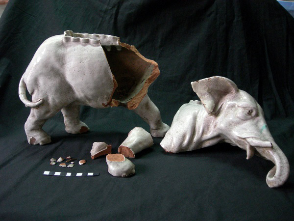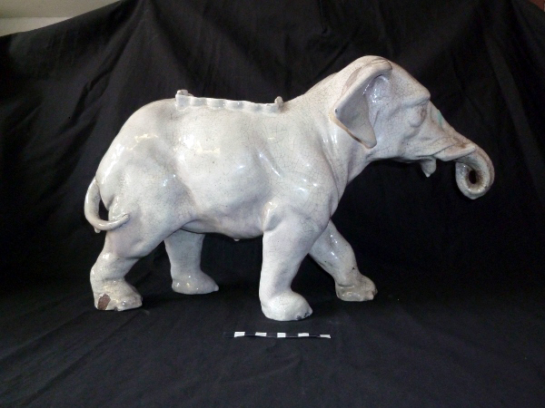 Ce très bel éléphant en céramique a été entièrement restauré de façon illusionniste. Grâce à un travail précis et respectueux de ses formes et de ses couleurs, la pièce a retrouvé toute sa prestance et son équilibre visuel.