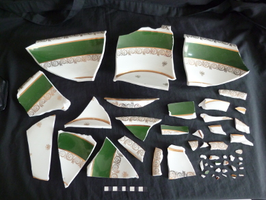 Une restauration partielle a permis de redonner vie à l’objet : collage soigné, comblement des manques avec de la résine transparente, retouche illusionniste sur la frise intérieure verte, et reprise légère des dorures. L’ensemble a ainsi retrouvé son harmonie visuelle sans masquer son histoire.