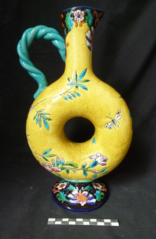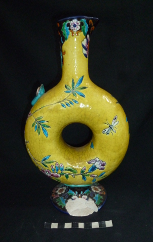 Cette élégante bouteille en faïence de Longwy, au bel émail jaune, présentait une anse torsadée manquante ainsi qu’un éclat important sur le pied. Une restauration illusionniste a permis de reconstituer fidèlement les éléments endommagés, redonnant à la pièce son équilibre et son éclat d’origine, dans le respect du style Longwy.