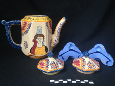 Le sucrier de ce service en faïence de Quimper avait perdu son couvercle, mais grâce à l’initiative de l’épouse du propriétaire, une copie fidèle a pu être réalisée à partir du couvercle de la théière assortie.