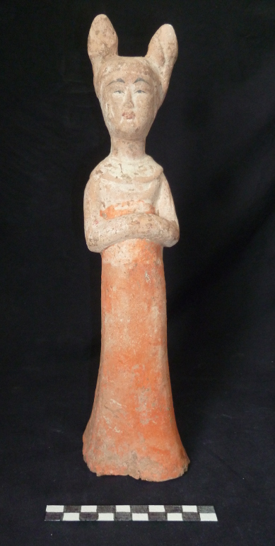 Cette statuette en terre cuite, datant de la dynastie Tang, présente une teinte « crème » rehaussée de peintures d’époque dans des tons orangés et noirs.
