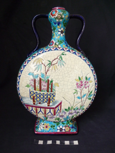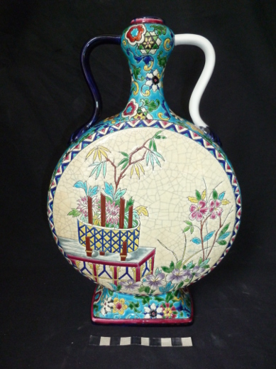 Cette bouteille en faïence émaillée de Longwy, dont l’anse était manquante, a été restaurée avec soin selon les techniques traditionnelles. Grâce à une réparation minutieuse, l’objet a retrouvé son authenticité et son élégance d’origine.